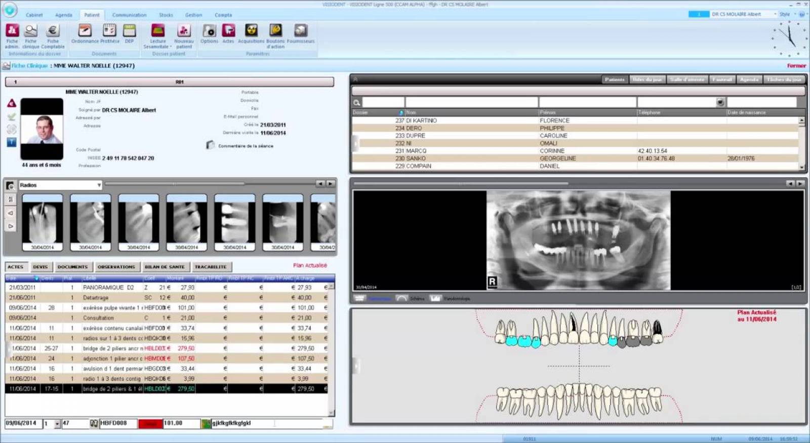 Toutes les données sont visibles en un coup d’oeil sur un seul et même écran. Vous y trouverez l’état civil, ses radios, l’historique clinique, les schémas dentaires ainsi qu’un aperçu de la salle d’attente. La ligne 500 est ouverte à l’ensemble des systèmes d’imagerie du marché.