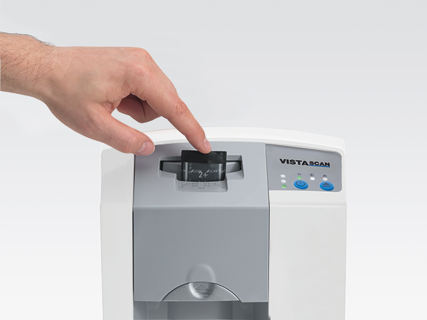 Le VistaScan Mini accélère encore les diagnostics par écrans à mémoire. Cet appareil compact est particulièrement simple à utiliser et ne prend que très peu de place – il peut donc être placé dans la salle de soins du cabinet. L'avantage : radiographie et numérisation peuvent se faire à proximité directe du fauteuil. Les écrans à mémoire réutilisables du VistaScan Mini existent dans tous les formats intra-oraux. Ils se manipulent plus facilement que les capteurs, se lisent en quelques secondes et offrent une qualité exceptionnelle.